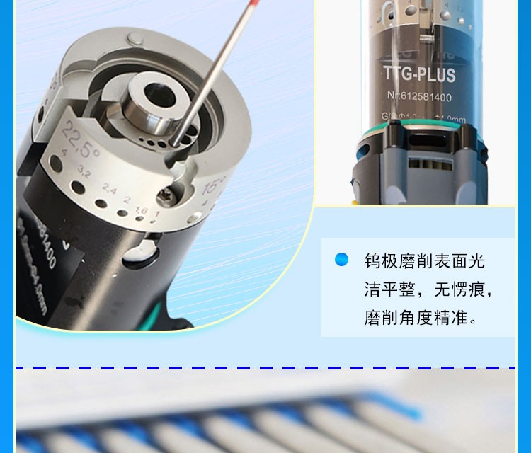 5.为焊接电弧质量提供根本保证 The portable tungsten electrode grinder is mainly used for grinding the angle of the tungsten electrode tip, flat tip, and fixed length cutting. The processed tungsten electrode can be directly used for WIG - or TIG welding equipment. Using this tungsten electrode grinding machine to process tungsten electrodes is simple and convenient, with high processing accuracy and good consistency. And it can effectively reduce workers' inhalation of heavy metal dust such as tungsten and thorium, thereby protecting their health. 1. Various tungsten electrodes can be ground into ideal and precise angles
