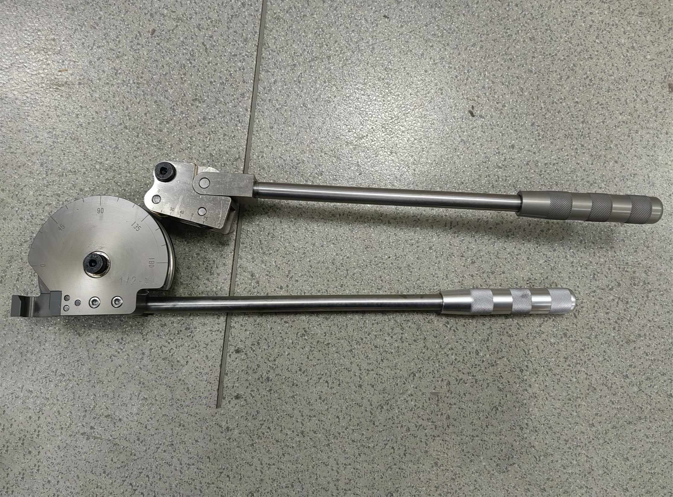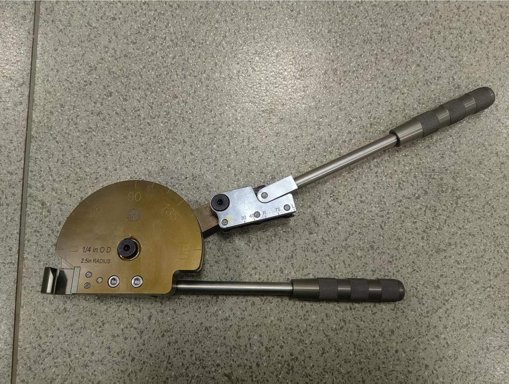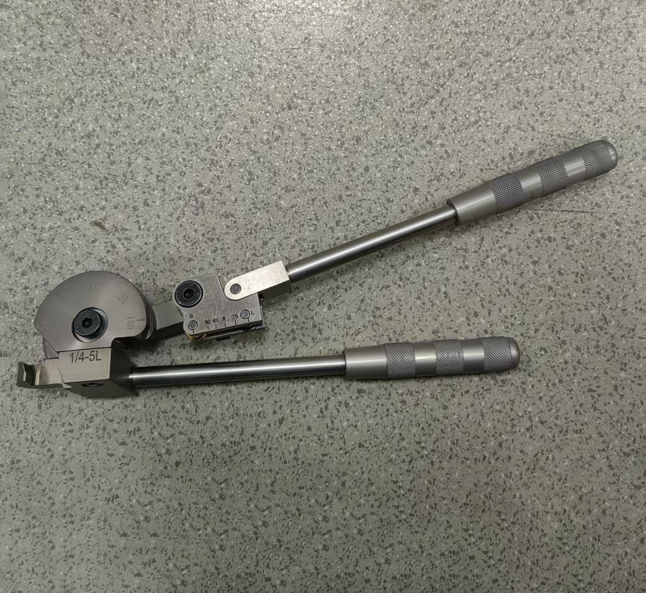 现市面上最常见的弯管器品牌有里奇和世伟洛克等,这些品牌的弯管器般都是小倍率的,多数是三倍弯。为满足半导体行业大倍率弯管要求,我司特意开发了此款大倍率弯管器,最大倍率可以做到十倍弯。而且我们可以非标定制。但也正因为如此,小批量或非标单件生产的模式,其售价也相对较高。有需要特殊弯管要求的可以电话询问我司。 1.弯管圈采用航空合金铝材质,不会损坏管外壁。2.特殊铜材质的导轮,更经久耐用。表面光滑,不会损坏管外壁,3.加长的弯管手柄,使工作更轻松。 4.表面经过镀镍处理,更加防锈, 5.弯管圈上清晰的角度指示,使弯管角度更加可控。6.防滑型软胶手柄套,使工作更加安全 The most common brands of pipe benders on the market now are Richie and Swagelock, etc. These brands of pipe benders are generally small magnification, mostly triple bending. To meet the high magnification bending requirements of the semiconductor industry, our company has specially developed this high magnification bending machine, which can achieve a maximum magnification of ten times bending. And we can customize it non-standard. But precisely because of this, the mode of small batch or non-standard single piece production also has a relatively high selling price. If you need special bending requirements, you can call our company to inquire. 1. The bent pipe ring is made of aviation alloy aluminum material, which will not damage the outer wall of the pipe, 2. Special copper material guide wheels are more durable and long-lasting. The surface is smooth and will not damage the outer wall of the pipe, 3. The extended bend handle makes work easier, 4. The surface has been treated with nickel plating, making it more rust resistant, 5. Clear angle indications on the bend ring make the bend angle more controllable, 6. Anti slip soft rubber handle cover makes work safer.